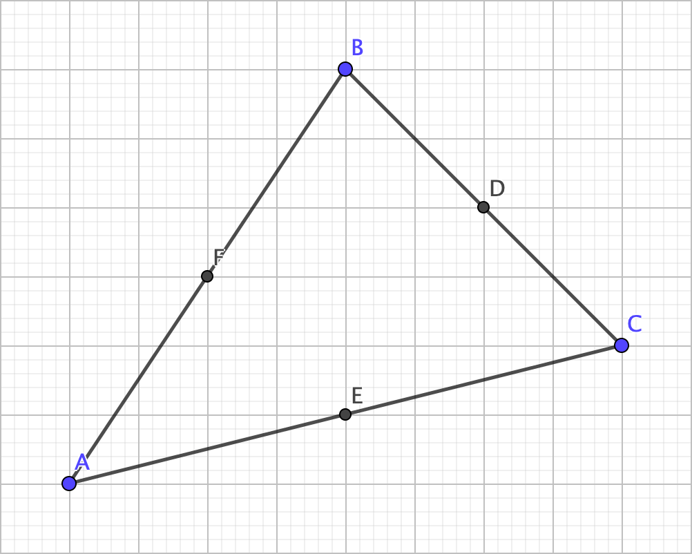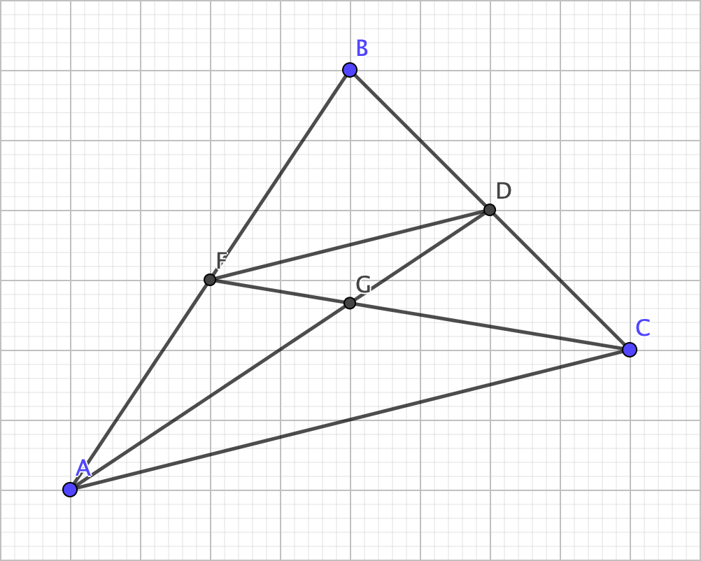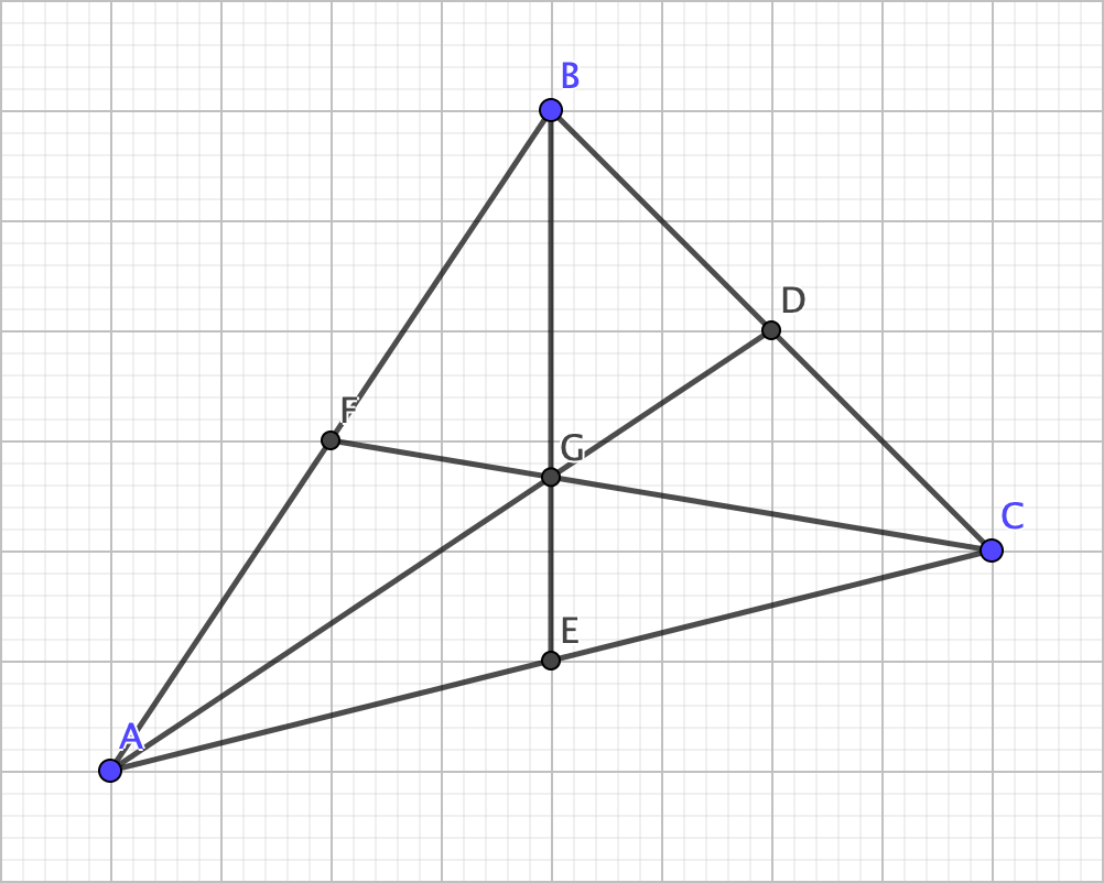 Anyway, the next part involves using the two medians as shown. As angles DGF and AGC are vertical, they are congruent. Next, because because the line segment connecting A and C and the line segment connecting F and D are parallel, angles GDF and GAC must also be congruent as they are alternate interior angles, thereby making triangles GDF and GAC similar with a side length ratio of 1:2. Thus, AG = 2 x GD and CG = 2 x GF. Likewise, the same process can show that BG = 2 x GE.